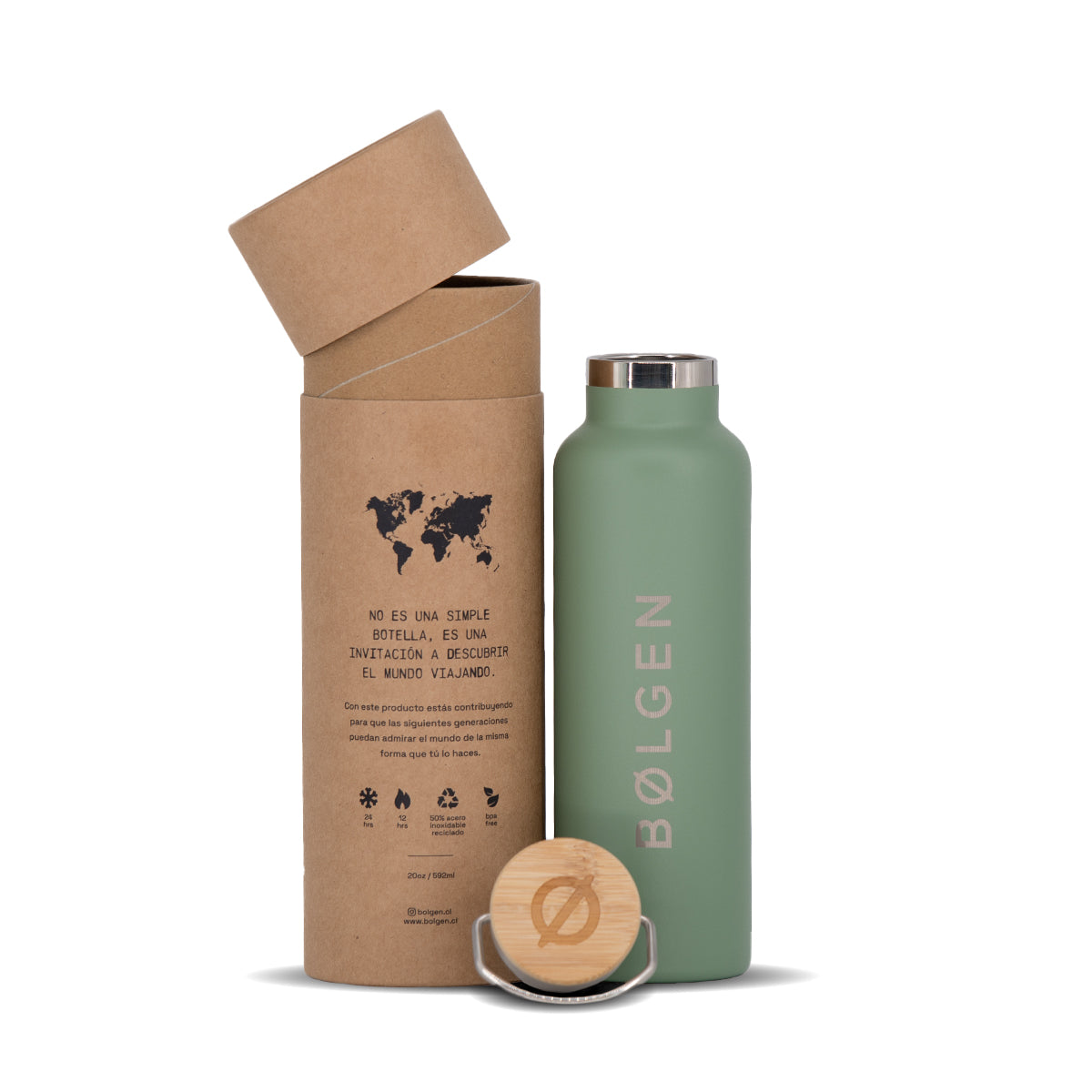 Producida con 50% de acero inoxidable reciclado, BPA Free y tapa de Bambú. Esta botella es durable, resistente y segura para las personas y el medio ambiente.
