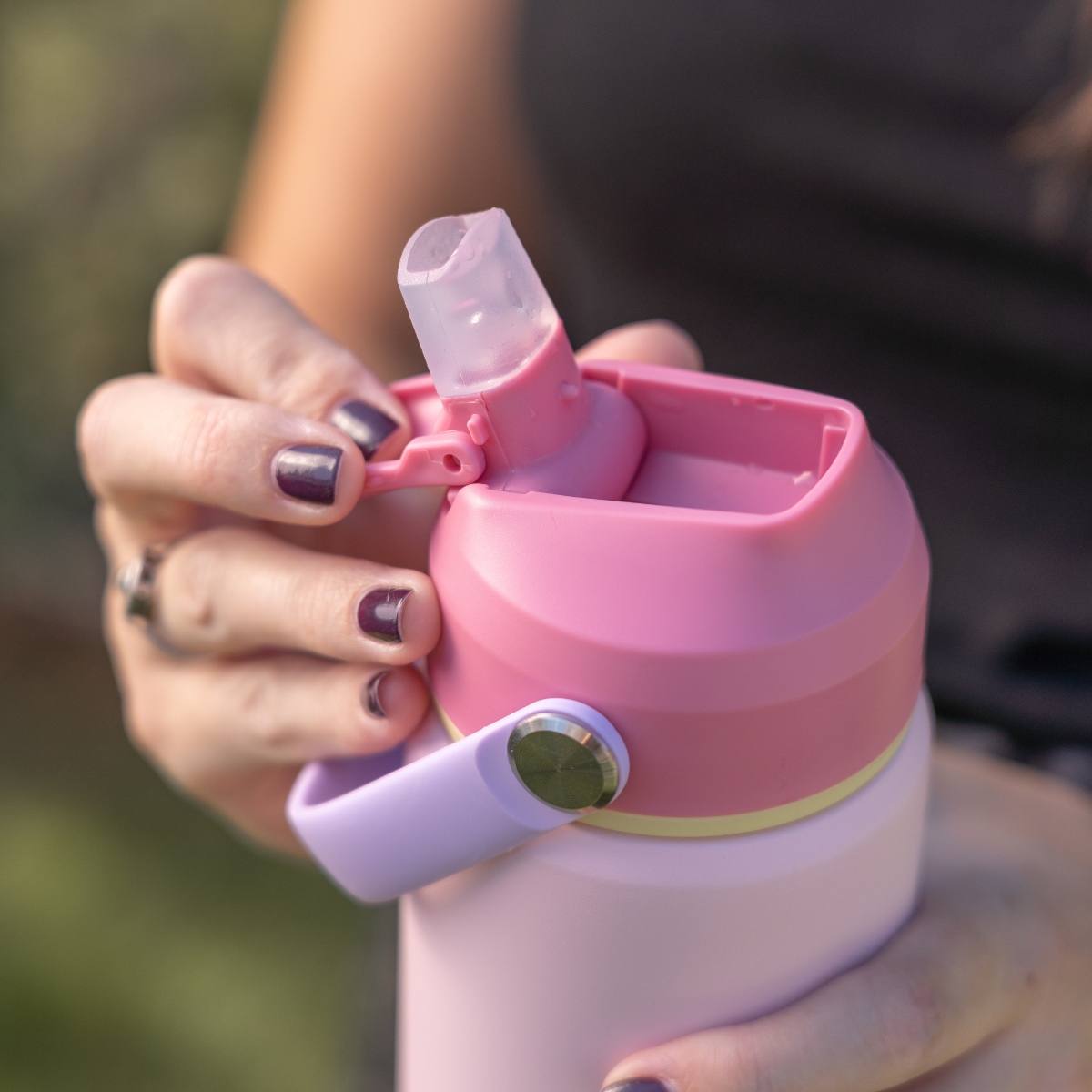 La tapa se abre completamente para poder llenar con líquidos, hielo o lo que quieras, de forma fácil y rápida. La boquilla cerrada funciona como antiderrame para permitir transportarla de manera segura y sin problemas. (Mientras la boquilla se encuentre abierta no funciona como antiderrame ya que contiene un orificio en la tapa para permitir el flujo de aire y que continue saliendo líquido cuando se succiona)